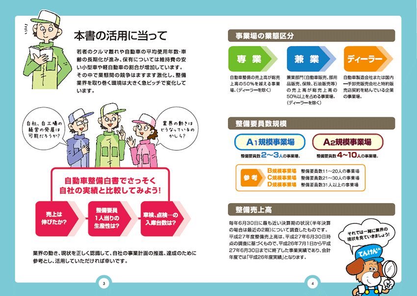 中面 表紙 整備業界向け案内パンフレット Agent/邦美印刷株式会社業界向けの案内のため、内容が硬くならないようイラストを交えながら数値やグラフを表現しています。毎年イラストのタッチを変えると共に楽しい雰囲気のデザインを心がけています。